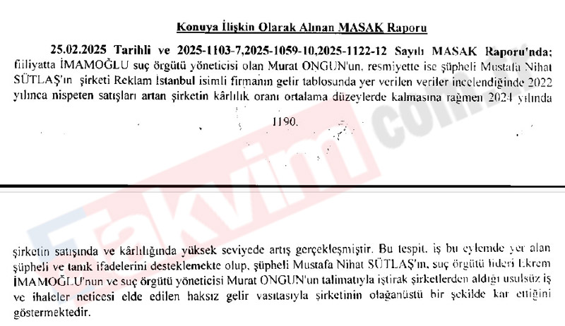 İddianamede, MASAK raporu doğrultusunda, "Fiiliyatta İmamoğlu suç örgütü yöneticisi olan Ongun'un, resmiyette ise şüpheli Mustafa Nihat Sütlaş'ın şirketi olan Reklam İstanbul isimli firmanın gelir tablosunda yer verilen veriler incelendiğinde, 2022 yılında nispeten satışları artan şirketin karlılık oranı ortalama düzeylerde kalmasına rağmen 2024 yılında şirketin satışında ve karlılığında yüksek seviyede artış gerçekleşmiştir. Bu tespit, iş bu eylemde yer alan şüpheli ve tanık ifadelerini desteklemekte olup, Sütlaş'ın, İmamoğlu'nun ve Ongun'un talimatıyla iştirak şirketlerden aldığı usulsüz iş ve ihaleler neticesi elde edilen haksız gelir vasıtasıyla şirketinin olağanüstü bir şekilde kar ettiğini göstermektedir." tespitlerine yer verildi.