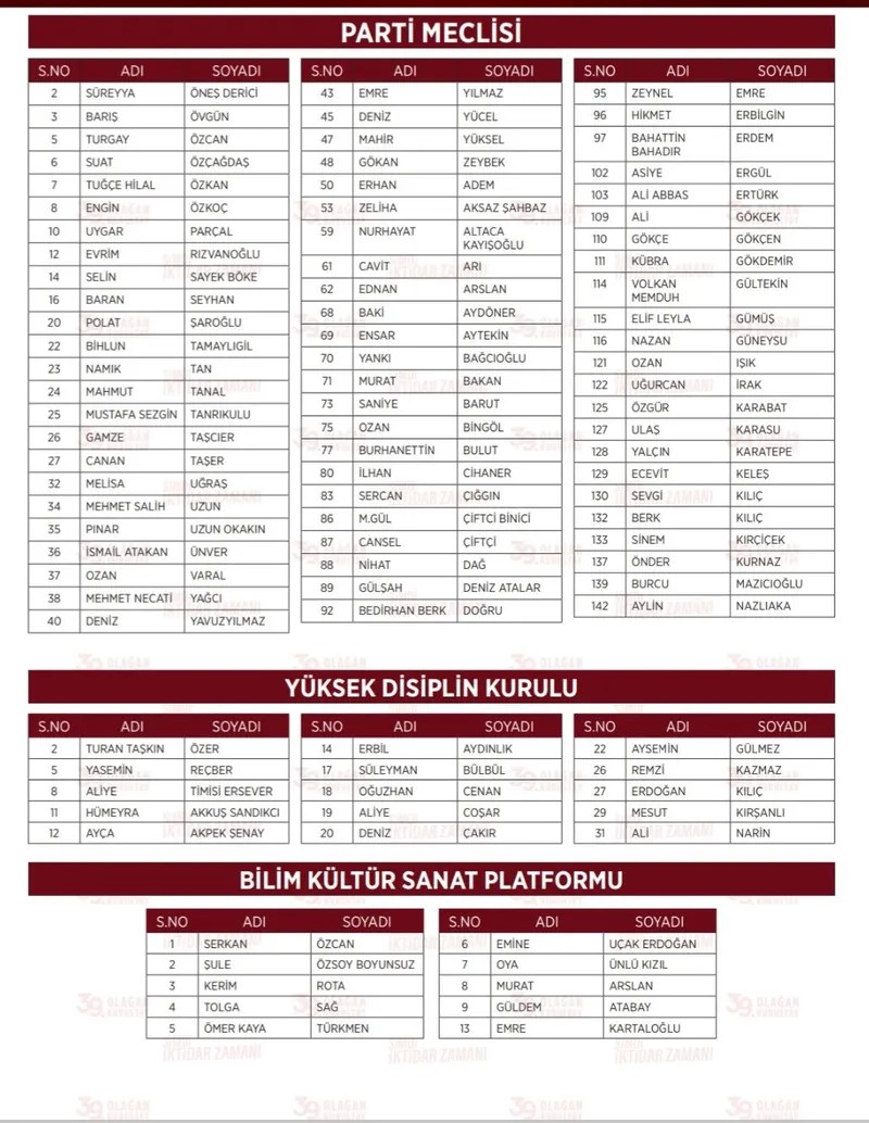 Önceki PM'de görev alan 39 isim yerini korurken 13 isim anahtar listede bulunmuyor. Mevcut Merkez Yönetim Kurulu'ndaki tüm üyelere, anahtar listede yer verildi.