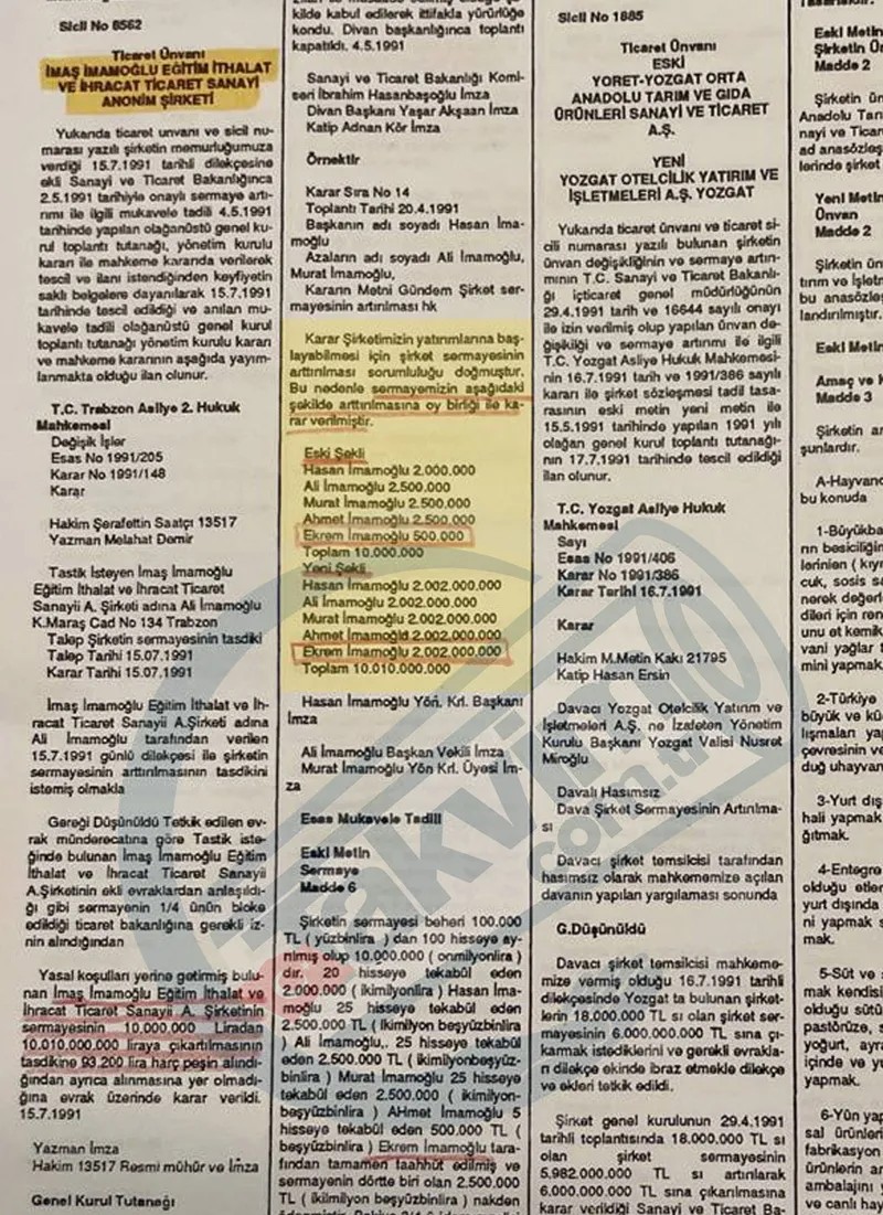 Buna göre; 1990'da İstanbul Üniversitesi İşletme Fakültesi'ne sunduğu forma bizzat el yazısıyla "Ekonomik durumum iyi değildir" yazan İmamoğlu'nun aynı yıl kurulan İmamoğlu Eğitim İthalat ve İhracat Ticaret Sanayi Anonim Şirketi'nde (İMAŞ) hisse sahibi olduğuna dair belge.
