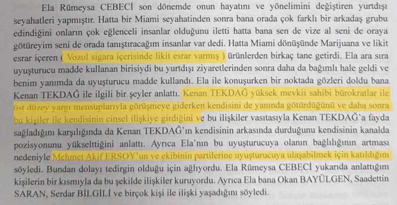Konuya ilişkin bir tanık, "Ela ile konuşuyordum, gözleri doldu. Kenan Tekdağ ile ilgili anlatmaya başladı. Kenan Tekdağ, yüksek mevki sahibi bürokratlar ile üst düzey yargı mensuplarıyla görüşmeye giderken kendisini de yanında götürdüğünü ve daha sonra bu kişilerle kendisinin cinsel ilişkiye girdiğini anlattı" dedi.