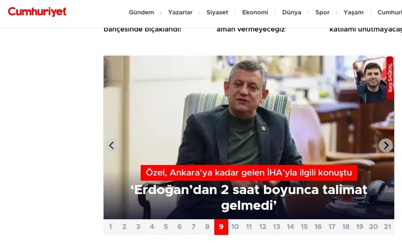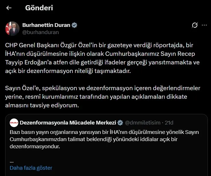 Cumhurbaşkanı İletişim Başkanı Burhanettin Duran, "CHP Genel Başkanı Özgür Özel'in bir gazeteye verdiği röportajda, bir İHA'nın düşürülmesine ilişkin olarak Cumhurbaşkanımız Sayın Recep Tayyip Erdoğan'a atfen dile getirdiği ifadeler gerçeği yansıtmamakta ve açık bir dezenformasyon niteliği taşımaktadır" ifadelerini kullandı.