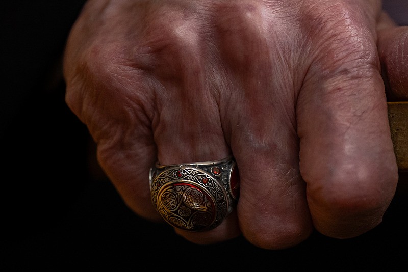Öte yandan Bahçeli'nin, Fettahoğulları aile mührünün yer aldığı, hat sanatıyla yazılmış Besmele ile Fetih, İhlas ve Fatiha surelerinin bulunduğu bir rozet, merkezinde yine Fettahoğulları aile mührünün yer aldığı, çevresinde Besmele ile Fetih, İhlas ve Fatiha surelerinin hat sanatıyla işlendiği, yan yüzeylerinde ise Devlet Bahçeli tuğralarının bulunduğu bir yüzük taktığı görüldü.