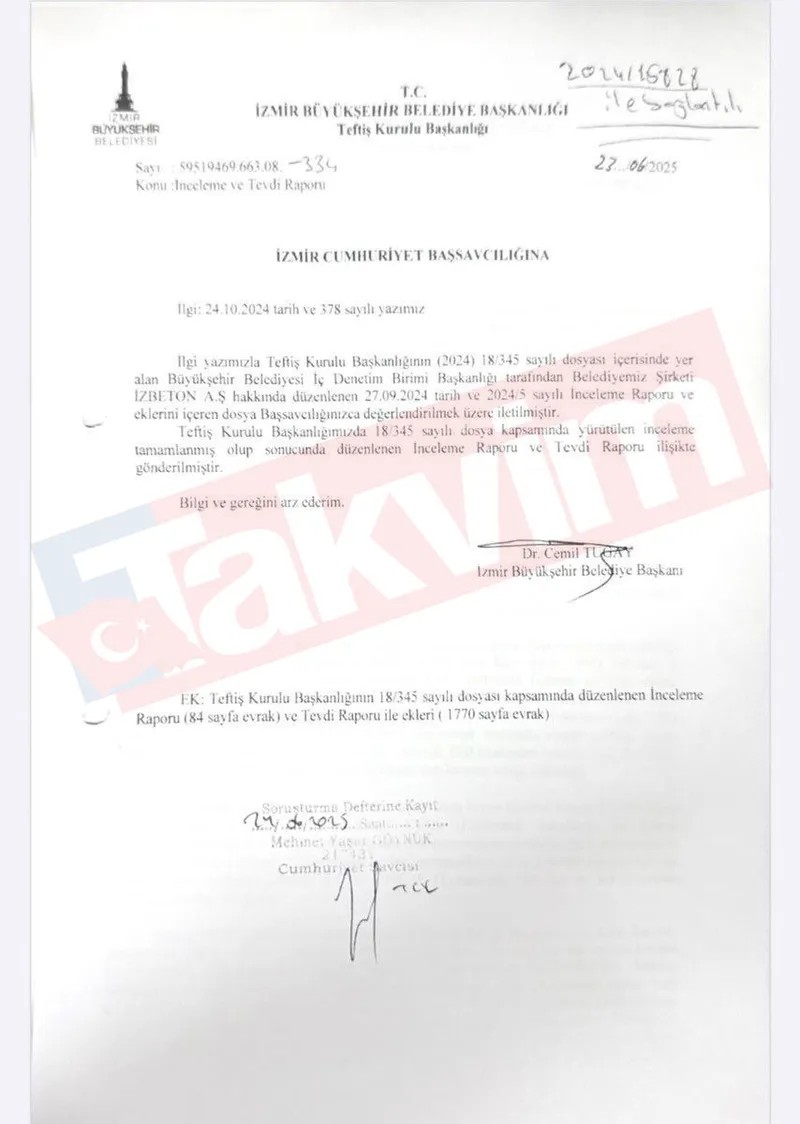 İzmir Cumhuriyet Başsavcılığı, 1 Temmuz 2025'te İzmir Büyükşehir Belediyesi iştiraki İZBETON AŞ üzerinden taşeron şirketler aracılığıyla yolsuzluk yapıldığı iddiasıyla soruşturma başlattı.