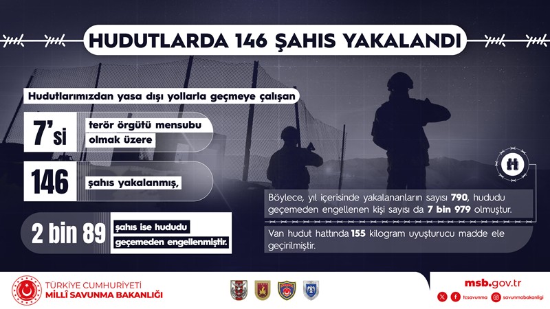 "Hudutlarımızdan yasa dışı yollarla geçmeye çalışan 7'si terör örgütü mensubu olmak üzere 146 şahıs yakalanmış, 2 bin 89 şahıs ise hududu geçemeden engellenmiştir. Böylece, yıl içerisinde sınırlarımızdan yasa dışı yollarla geçmeye çalışırken yakalananların sayısı 790, hududu geçemeden engellenen kişi sayısı da 7 bin 979 olmuştur. Bu hafta içerisinde, Van hudut hattında yapılan arama-tarama faaliyetinde 155 kilogram uyuşturucu madde ele geçirilmiştir."