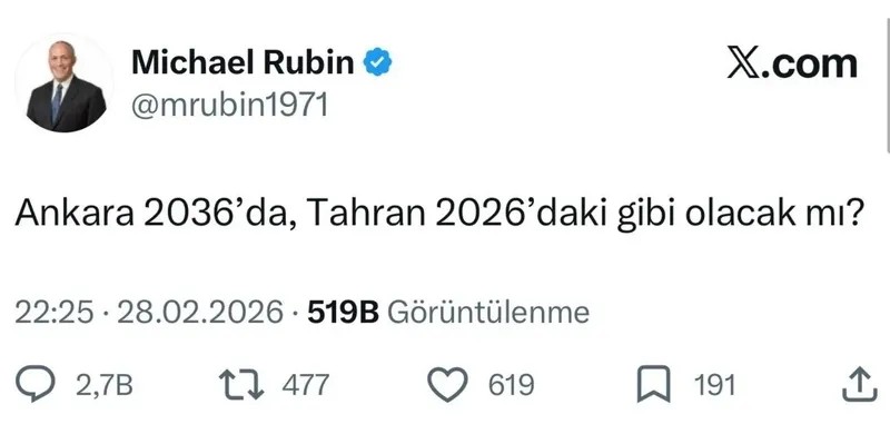 CIA-Pentagon'un psikolojik harp elemanı Michael Rubin, Türkçe paylaşım yapıp "İran'dan sonra sıra Türkiye'de" mesajı verdi. Derin Amerika ve İsrail'in tetikçiliğini yapan Rubin "Ankara 2036'da, Tahran 2026'daki gibi olacak mı?" dedi.