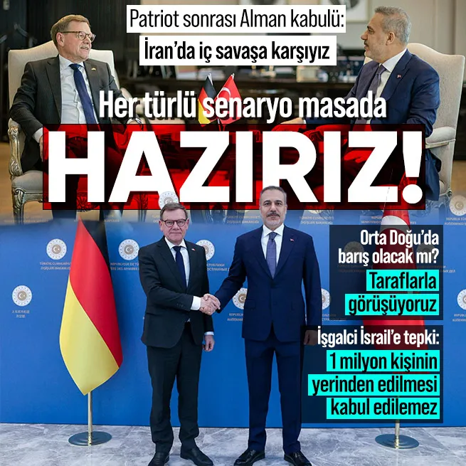 Dışişleri Bakanı Hakan Fidan, Almanya Federal Cumhuriyeti Dışişleri Bakanı Johann David Wadephul ile bir araya geldi. Bakan Fidan, Alman mevkidaşı Wadephul ile ortak basın toplantısında açıklamalarda bulundu. Fidan, "İran'da iç savaş çıkarmayı ve etnik veya dinsel fay hatları üzerinden çatışmaları körükleyen her türlü plana sonuna kadar karşıyız."dedi.