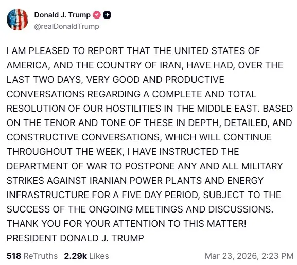 "ABD ve İran'ın, Orta Doğu'daki düşmanlıklarımızın tam ve kesin bir şekilde çözümü konusunda son 2 günde çok iyi ve verimli görüşmeler gerçekleştirdiğini bildirmekten memnuniyet duyuyorum. Bu derinlemesine, detaylı ve yapıcı görüşmelerin tonuna ve havasına dayanarak, devam eden toplantı ve görüşmelerin başarısına bağlı olarak, Savaş Bakanlığına İran enerji santrallerine ve enerji altyapısına yönelik her türlü askeri saldırıyı 5 günlük bir süre için erteleme talimatı verdim."