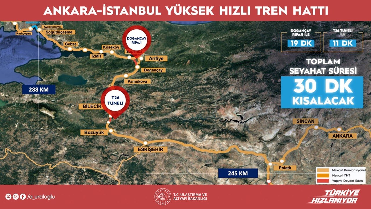 - T26 Tüneli ve Sapanca-Geyve arasındaki çalışmalar tamamlandığında Ankara-İstanbul arası YHT seyahat süresi 4 saat 7 dakikadan 3 saat 37 dakikaya düşecek.
