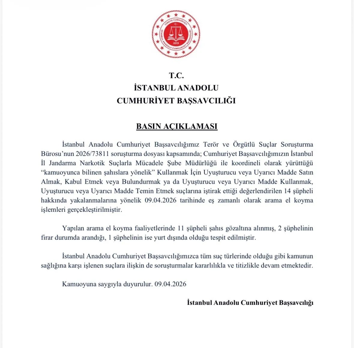 Uyuşturucu soruşturması kapsamında İstanbul Anadolu Cumhuriyet Başsavcılığınca yapılan açıklamada. 11 kişi'nin gözaltına alındığı, 2 kişiyi arama çalışmalarının sürdüğü bilgisi paylaşıldı. Ayrıca hakkında gözaltı kararı verilen bir kişinin yurt dışında olduğu tespit edildi.