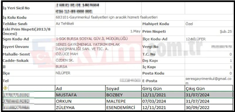 Dosyada ismi geçen Züleyha Esendemirci isimli şahsın 12.11.2021 ile 30.09.2022 yılları arasında SERES Gayrimenkul ünvanlı firmada SGK Kaydının bulunduğu, şahsın şu an için aktif olarak Bursa Büyükşehir Belediyesinde ÖZEL KALEM olarak görev aldığı saptandı. Şahsın eşi olan Aytunç ESENDEMİRCİ'nin evveliyatında Nilbel bünyesinde görev yaptığı ve aktif olarak Bursa Büyükşehir Belediyesinde yer aldığı belirlendi.