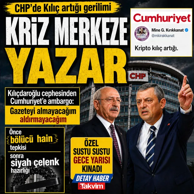 - Cumhuriyet gazetesi yazarı Mine Kırıkkanat'ın Kemal Kılıçdaroğlu'na yönelik 'kripto kılıç artığı' hakareti CHP içinde krize yol açtı ve Kılıçdaroğlu'nun avukatı yargıya başvuracaklarını açıkladı.