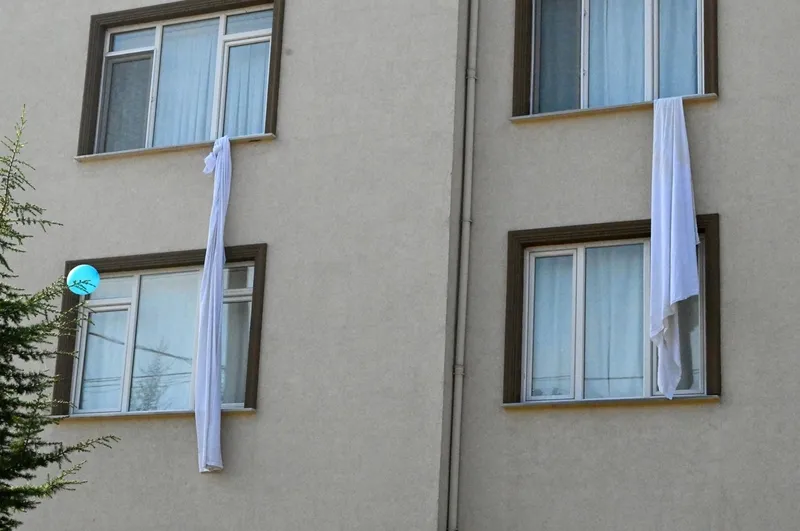 Duruşma öncesi facianın sembolü olan beyaz çarşaflar mahkeme salonunun dışındaki stantlara asıldı.