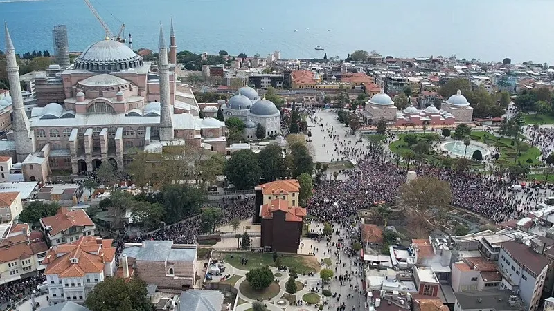 Filistin'in özgürlüğü ve Küresel Sumud Filosu'na destek için "Filistin'e Destek Platformu" öncülüğünde Ayasofya Camii önünde öğle namazı kılan grup,"Özgürlüğe Yürüyoruz" sloganıyla Eminönü meydanına yürüyor.