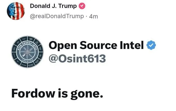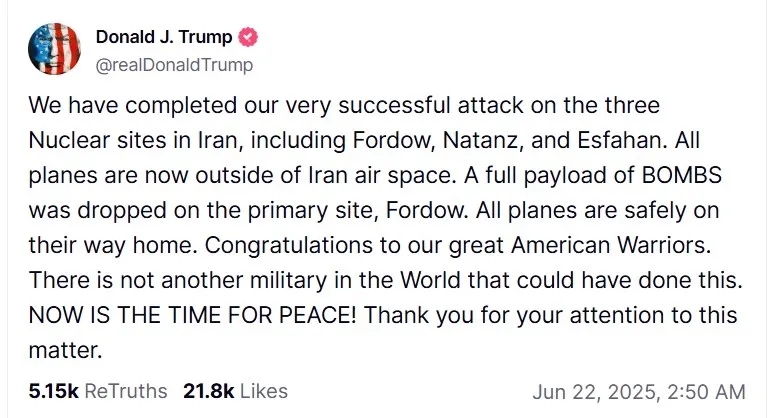 Trump, "Uydu görüntülerinin gösterdiği gibi, İran'ın 3 nükleer tesisine devasa hasar verildi. Yok olma doğru bir terimdir. Gösterilen beyaz yapı kayaya derin bir şekilde gömülmüş, hatta çatısı bile yer seviyesinin çok altında ve alevden tamamen korunmuştur. En büyük hasar yer seviyesinin çok altında meydana geldi. Tam isabet!" ifadelerini kullandı.