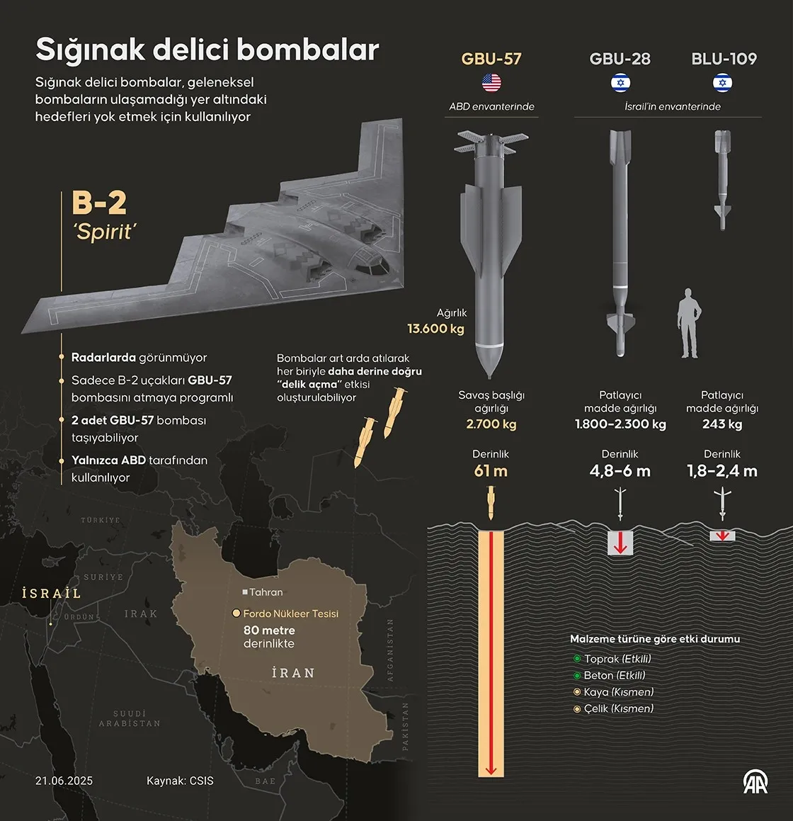 ABD uçakları İran'ın 3 nükleer tesisini hedef aldı. ABD, Fordo nükleer tesisine 6 adet 15 tonluk sığınak delici bomba bıraktı.