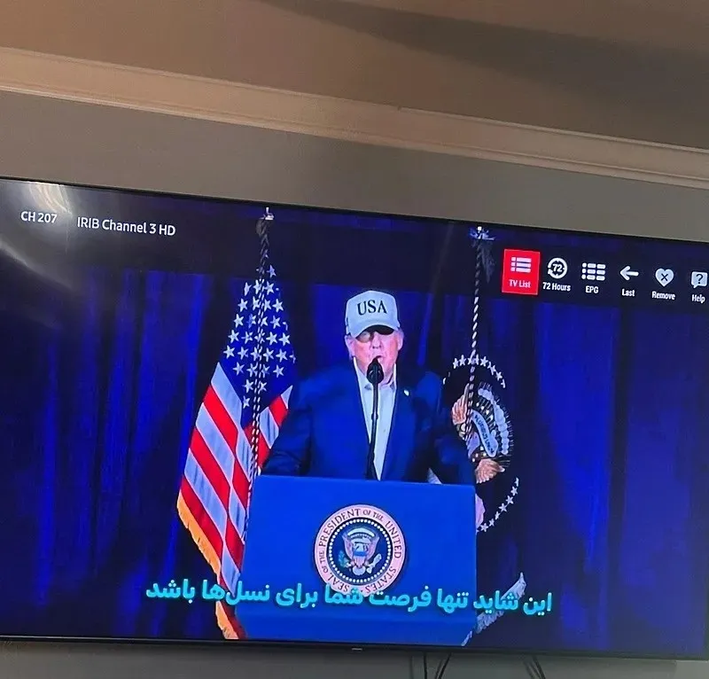 Yayın kesintisi sırasında ABD Başkanı Donald Trump ile İsrail Başbakanı Binyamin Netanyahu'nun İran halkına hitaben yaptığı konuşma Farsça altyazıyla ekrana getirildi. Trump ve Netanyahu, konuşmalarında İran yönetimini hedef alarak, İran halkını harekete geçmeye çağırdı. Netanyahu konuşmasında, "Terör rejimine ait binlerce hedefi vurduk. Cesur İran halkının kendisini esaret zincirlerinden kurtarması için gerekli şartları oluşturacağız. Bu nedenle size sesleniyorum İran vatandaşları, bu fırsatı kaçırmayın. Bu, nesilde bir kez gelen bir fırsattır. Elleriniz kollarınız bağlı oturmayın. Çünkü yakında sizin anınız gelecek, sokağa çıkmanızın isteneceği an" ifadelerini kullandı.