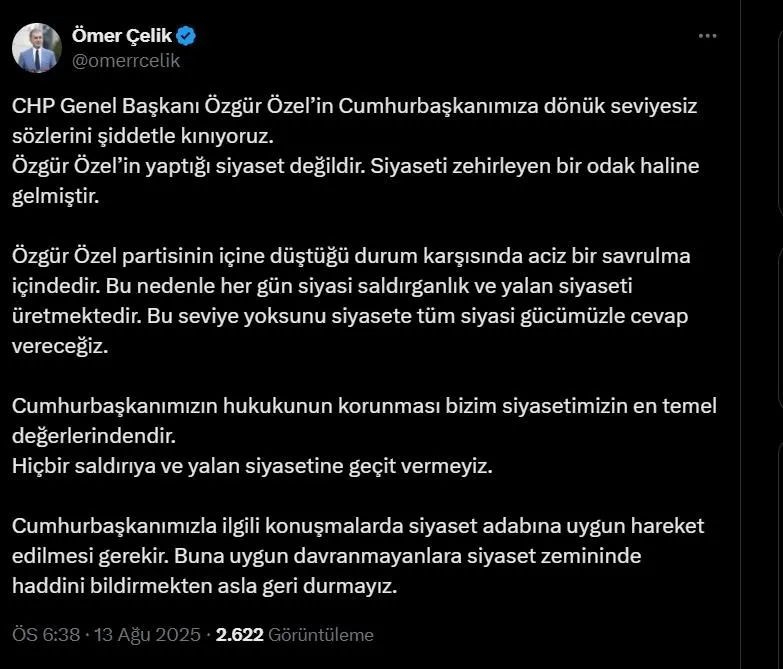 AK Parti Sözcüsü Ömer Çelik, Başkan Recep Tayyip Erdoğan'ı hadsiz sözlerle hedef alan CHP'li Özel'e sert tepki gösterdi.