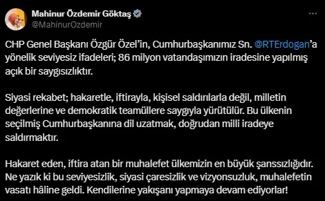 Aile ve Sosyal Hizmetler Bakanı Mahinur Özdemir Göktaş, "CHP Genel Başkanı Özgür Özel’in, Cumhurbaşkanımız Sn. Recep Tayyip Erdoğan'a yönelik seviyesiz ifadeleri; 86 milyon vatandaşımızın iradesine yapılmış açık bir saygısızlıktır.