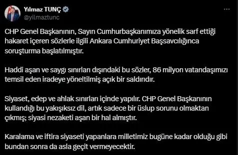 Adalet Bakanı Yılmaz Tunç,"CHP Genel Başkanının, Sayın Cumhurbaşkanımıza yönelik sarf ettiği hakaret içeren sözlerle ilgili Ankara Cumhuriyet Başsavcılığınca soruşturma başlatılmıştır.