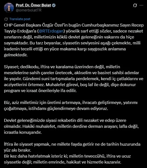 "CHP Genel Başkanı Özgür Özel'in Cumhurbaşkanımıza dönük seviyesiz sözlerini şiddetle kınıyoruz. Özgür Özel'in yaptığı siyaset değildir. Siyaseti zehirleyen bir odak haline gelmiştir.