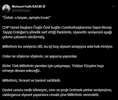 Sanayi ve Teknoloji BakanıMehmet Fatih Kacır sosyal medya hesabından Özel'e tepki gösterdi.