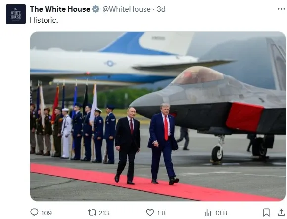 Trump-Putin görüşmesi, üçe üç formatında devam ederken Beyaz Saray'dan bir paylaşım daha geldi. Beyaz Saray'ın X hesabından yapılan paylaşımda Trump ile Putin'in pistte yürüdüğü anlara yer verilirken "Tarihi" notu düşüldü.