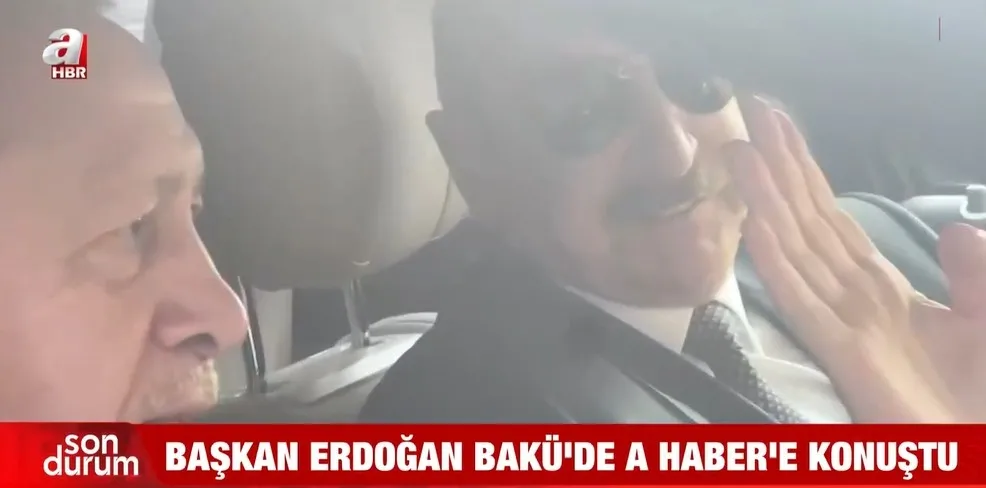 Başkan Erdoğan Karabağ Zaferi'nin 5. yıl dönümü kutlamalarında bulunmak üzere gittiği Azerbaycan'ın başkenti Bakü'de A Haber'e özel açıklamalarda bulundu. Aliyev ile birlikte bulunduğu araç içinden konuşan Başkan Erdoğan törenin iyi geçtiğini belirterek, "Konuşmayı beğendiniz mi"diye sordu?"Muhteşemdi" yanıtını alan Başkan Erdoğan daha sonra Aliyev'e dönerek"Banu bizim spiker" dedi.