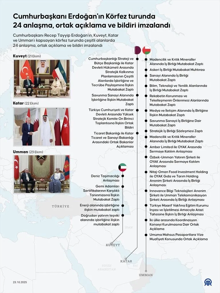 Başkan Recep Tayyip Erdoğan'ın, Kuveyt, Katar ve Umman'ı kapsayan körfez turunda çeşitli alanlarda 24 anlaşma, ortak açıklama ve bildiri imzalandı.
