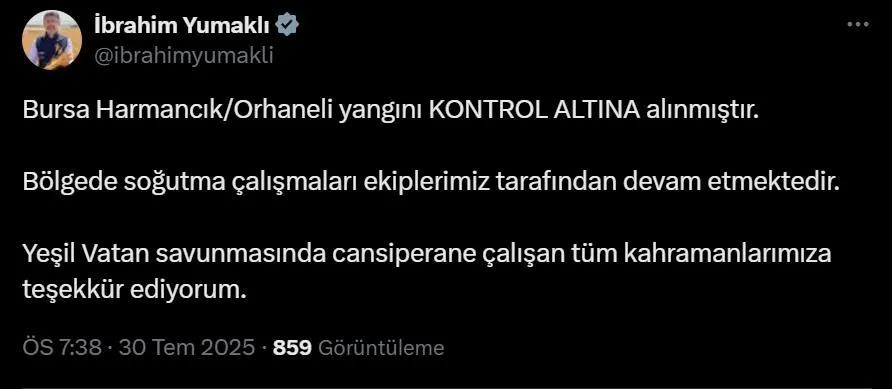 "Bursa Harmancık/Orhaneli yangını kontrol altına alınmıştır. Bölgede soğutma çalışmaları ekiplerimiz tarafından devam etmektedir. 'Yeşil Vatan' savunmasında cansiparane çalışan tüm kahramanlarımıza teşekkür ediyorum."