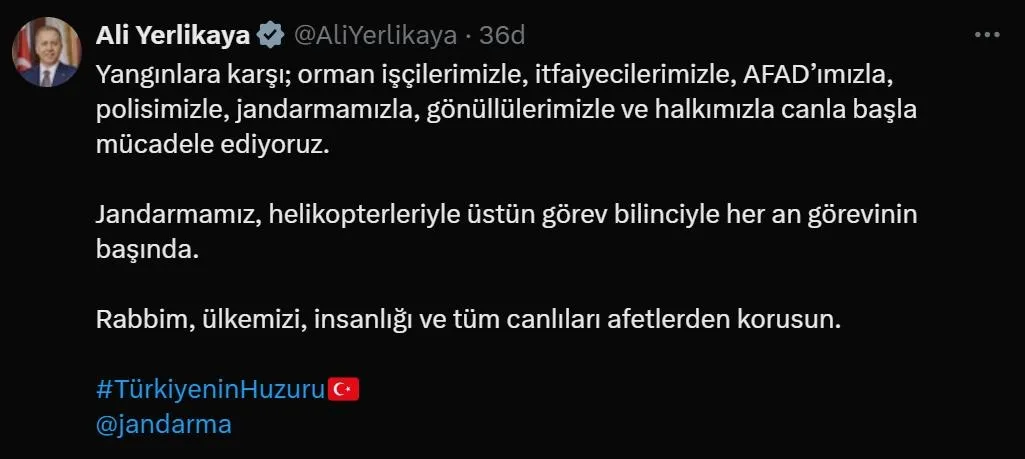 Yerlikaya, sosyal medya hesabından yaptığı paylaşımda, "Yangınlara karşı orman işçilerimizle, itfaiyecilerimizle, AFAD'ımızla, polisimizle, jandarmamızla, gönüllülerimizle ve halkımızla canla başla mücadele ediyoruz. Jandarmamız, helikopterleriyle üstün görev bilinciyle her an görevinin başında. Rabbim, ülkemizi, insanlığı ve tüm canlıları afetlerden korusun." ifadelerini kullandı.