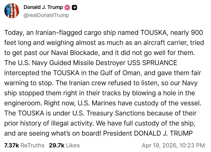 İran bayraklı Touska adlı kargo gemisinin ABD’nin deniz ablukasını aşmaya çalıştığını kaydeden Trump, ABD Donanması'na ait güdümlü füze destroyeri USS Spruance’nin Umman Körfezi'nde Touska’nın durması için uyarıda bulunduğunu belirtti.