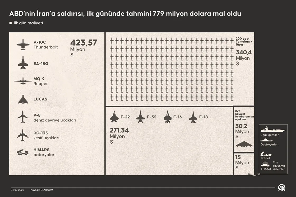 ABD ordusu, İran'a yönelik askeri harekatının ilk 24 saatinde yaklaşık 779 milyon dolar harcadığı hesaplandı.