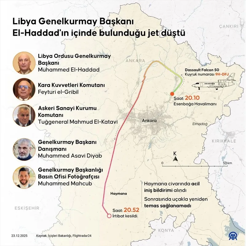 "23 Aralık 2025 günü Libya Genelkurmay Başkanı Orgeneral Muhammed Ali Ahmed Al Haddad ve maiyetindeki 4 kişi ile 3 mürettebatı taşıyan bir özel jet, 20.17'de Esenboğa Havalimanı'ndan kalktıktan sonra 20.33'te hava kontrol merkezine elektrik arızasından kaynaklı acil durum bildirmiş ve acil iniş talebinde bulunmuştur." bilgisini paylaşan Duran, şunları kaydetti: