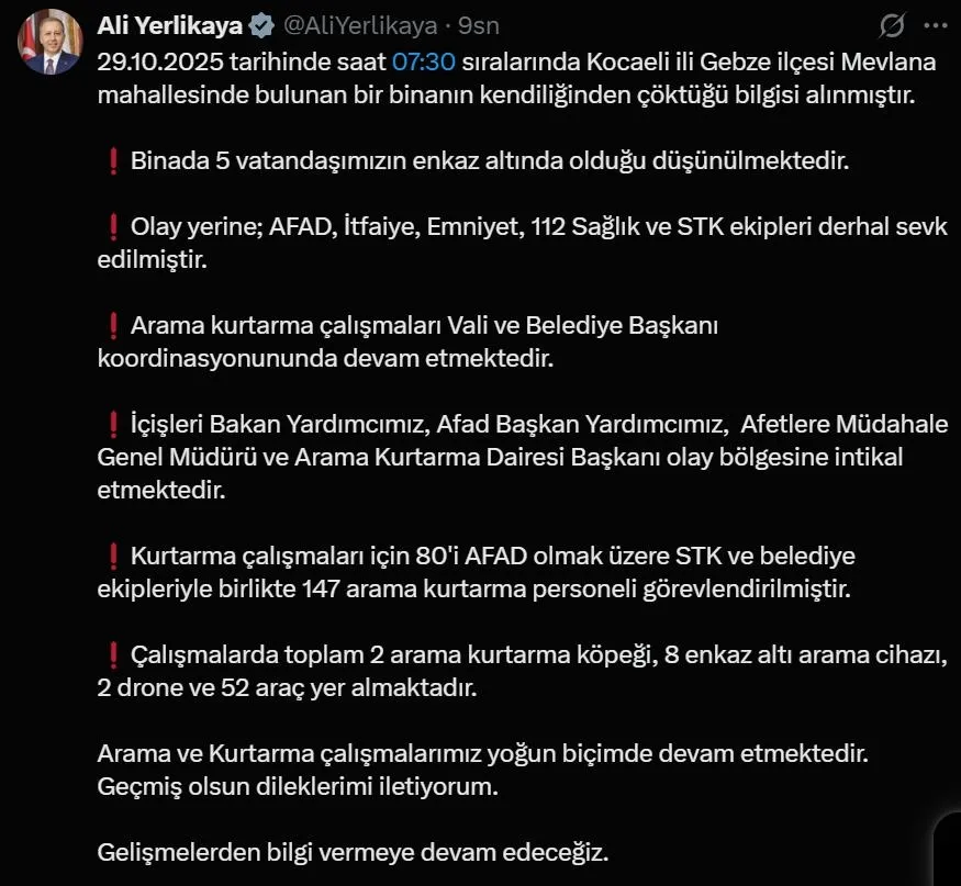 Kocaeli’nin Gebze ilçesinde meydana gelen bina çökmesiyle ilgili Gebze Cumhuriyet Başsavcılığı tarafından başlatılan adli soruşturma çok yönlü olarak devam etmektedir.Hepimizi derin bir üzüntüye sevk eden bu elim olayda hayatını kaybeden iki evladımıza Allah’tan rahmet, yaralı olarak kurtarılan evladımıza acil şifalar diliyorum.Enkaz altında bulunan anne ve babanın da sağ salim kurtarılmasını temenni ediyorum.Devletimizin tüm kurumları ilk andan itibaren büyük bir gayret ve özveriyle çalışmalarını sürdürmektedir.