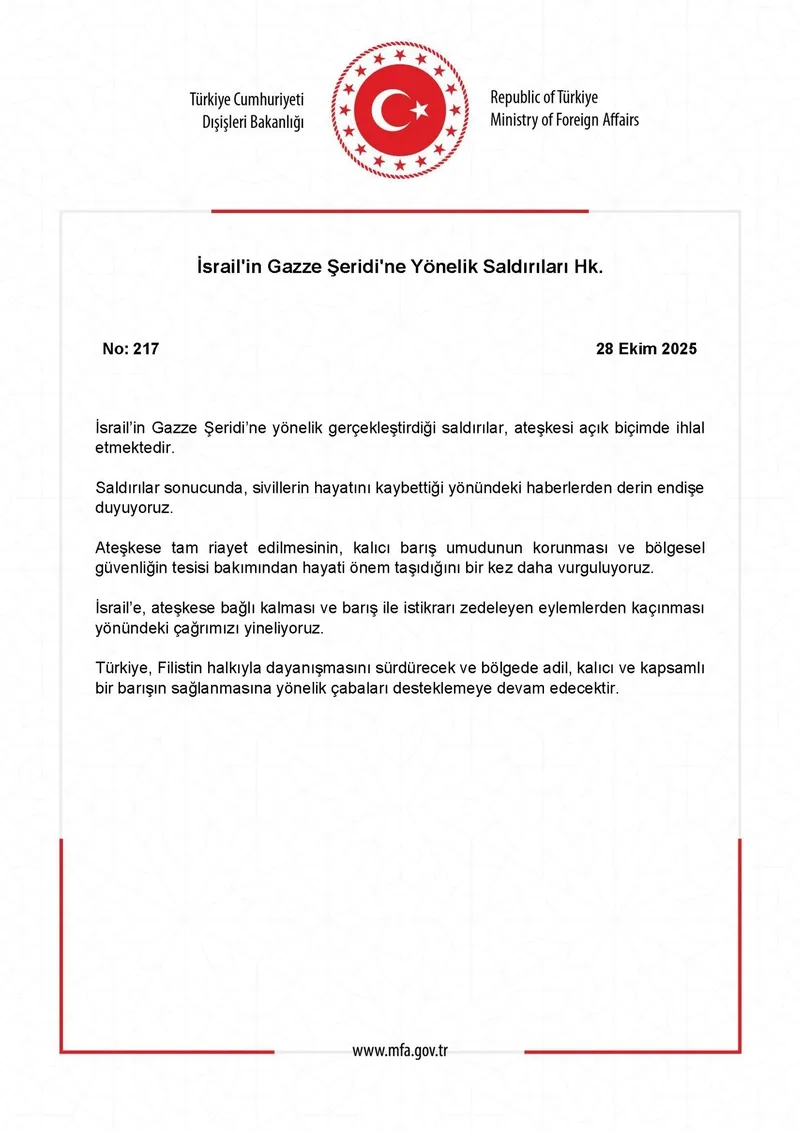 İsrail’e, ateşkese bağlı kalması ve barış ile istikrarı zedeleyen eylemlerden kaçınması yönündeki çağrımızı yineliyoruz. Türkiye, Filistin halkıyla dayanışmasını sürdürecek ve bölgede adil, kalıcı ve kapsamlı bir barışın sağlanmasına yönelik çabaları desteklemeye devam edecektir.