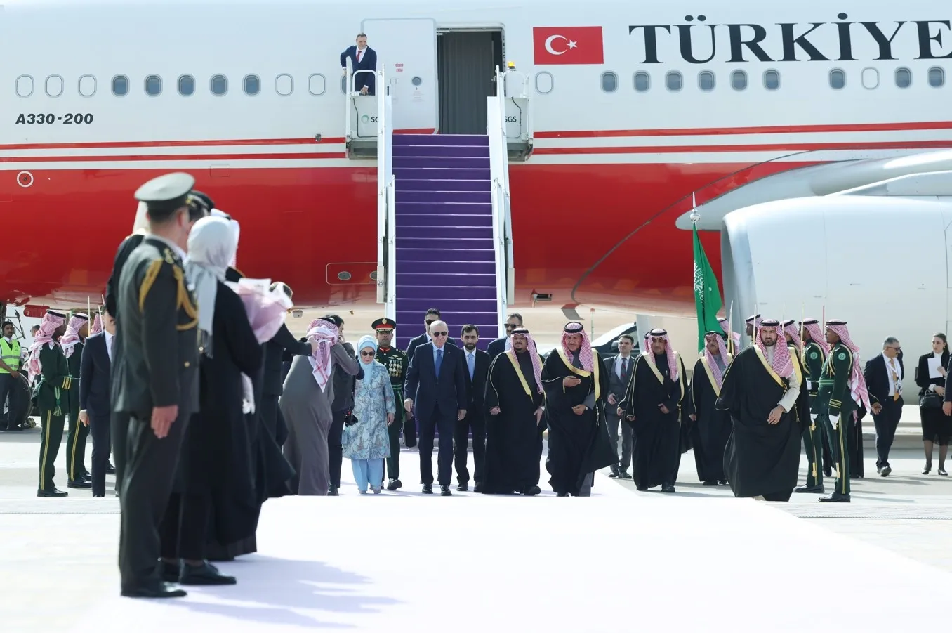Erdoğan ile eşi Emine Erdoğan, Dışişleri Bakanı Hakan Fidan, Hazine ve Maliye Bakanı Mehmet Şimşek, Aile ve Sosyal Hizmetler Bakanı Mahinur Özdemir Göktaş, Enerji ve Tabii Kaynaklar Bakanı Alparslan Bayraktar, Sanayi ve Teknoloji Bakanı Mehmet Fatih Kacır, Gençlik ve Spor Bakanı Osman Aşkın Bak, Milli Savunma Bakanı Yaşar Güler, Sağlık Bakanı Kemal Memişoğlu, Cumhurbaşkanlığı İletişim Başkanı Burhanettin Duran, Cumhurbaşkanı Dış Politika ve Güvenlik Başdanışmanı Akif Çağatay Kılıç ile bazı yetkililer de Suudi Arabistan'a gitti.