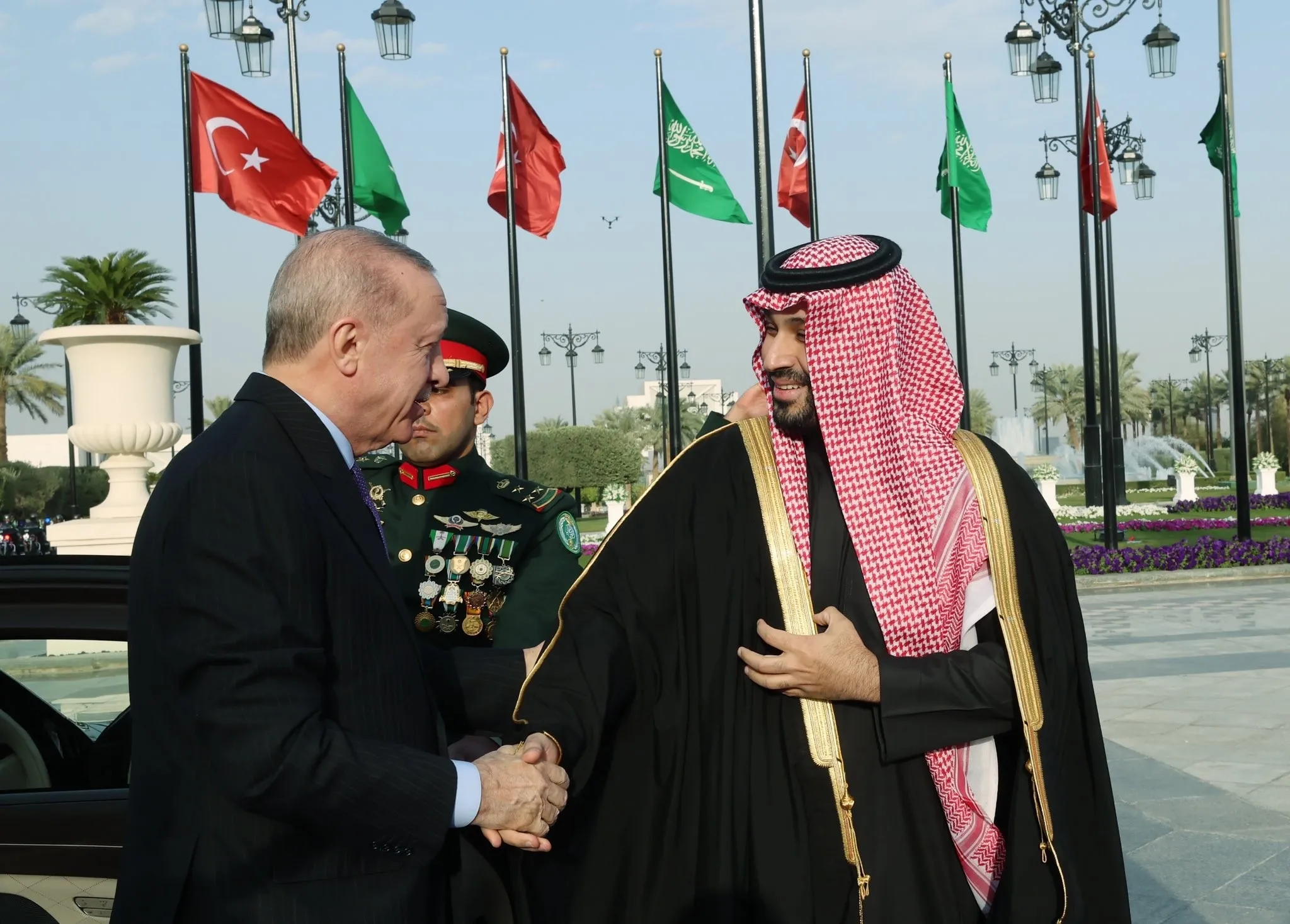Başkan Erdoğan, Yemame Sarayı'nın girişinde Suudi Arabistan Veliaht Prensi Muhammed bin Selman tarafından karşılandı, ardından iki ülkenin milli marşları çalındı.