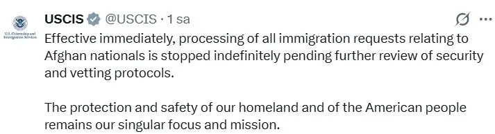 Yapılan açıklamada, "Afgan vatandaşlarıyla ilgili tüm göçmenlik başvurularının işleme alınması, güvenlik ve güvenlik soruşturması protokollerinin yeniden gözden geçirilmesine kadar süresiz olarak durdurulmuştur" ifadelerine yer verildi.