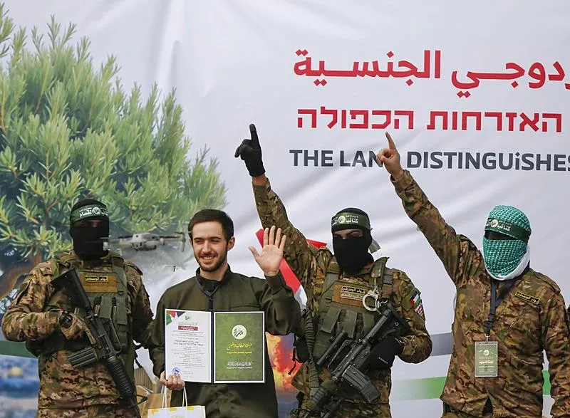 İsrailli esirlerden Omer Shem-Tov, Eliya Cohen ve Omer Wenkert, Gazze Şeridi'ndeki Nusayrat Mülteci Kampı'nda Kızılhaç'a teslim edildi.İsrailli rehine, serbest bırakılmadan önce Hamas savaşçılarının alnından öptü.