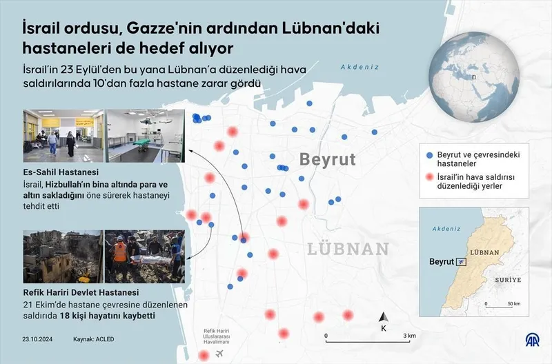 İsrail'in Beyrut'ta saldırı düzenlediği Refik Hariri Hastanesi'nin etrafı ise resmen enkaza döndü.