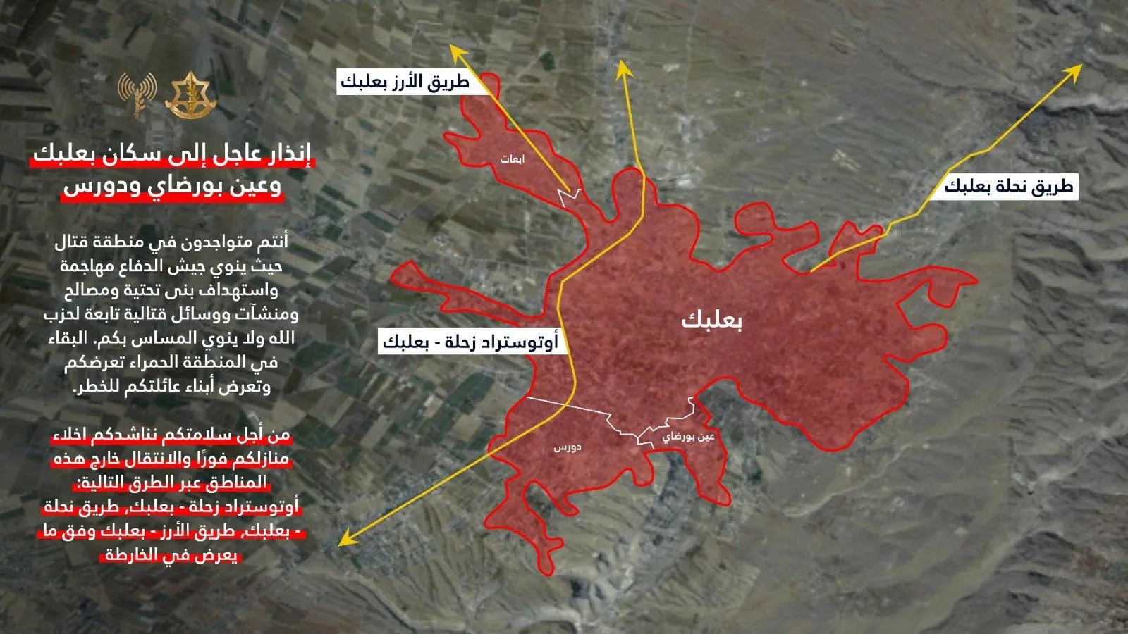 İsrail ordu sözcüsü Avichai Adrai, dün ve bugün X hesabından Baalbek ve çevresindeki beldeler için saldırı tehdidinde bulunmuştu. Dün İsrail'in saldırı tehdidinin ardından söz konusu bölgelerdeki halk güvenli alanlara gitmek için bulundukları yerleri terk etmişti.