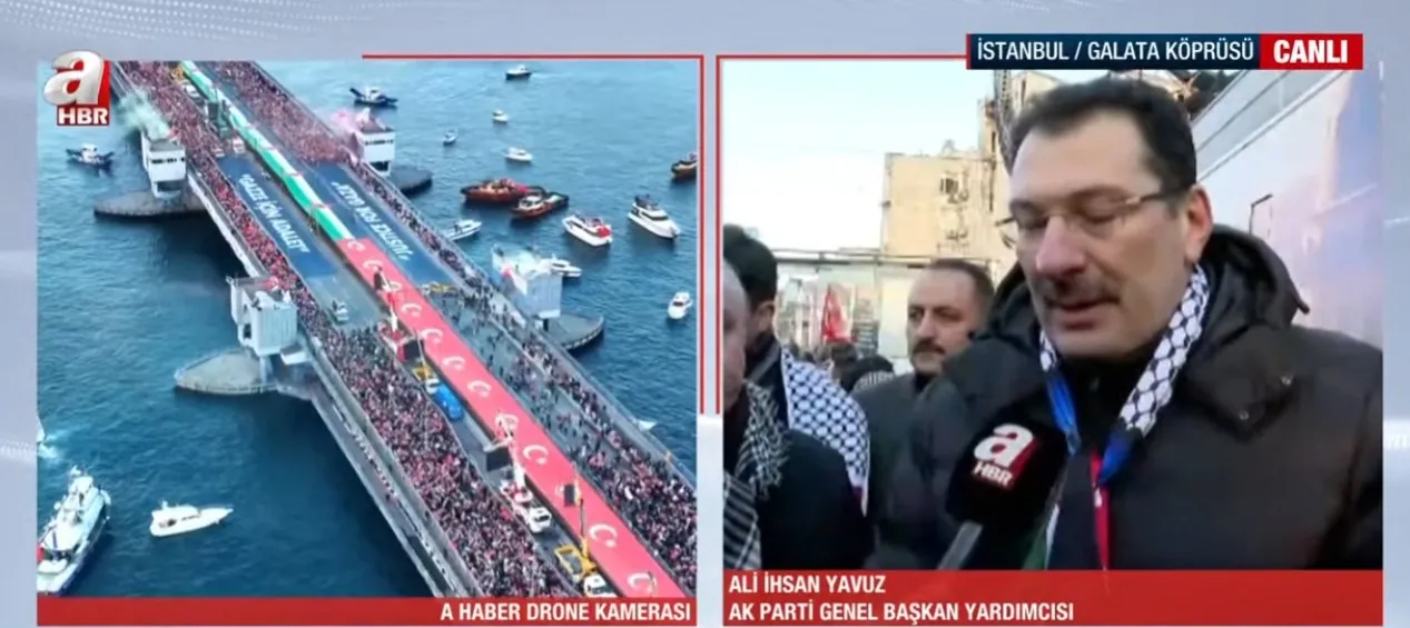 Son dakika! Başkan Recep Tayyip Erdoğan'ın liderliğinde Gazze’deki insanlık dramına karşı en gür sesi çıkaran Türkiye, yeni yılın ilk sabahında İstanbul'da dev bir yürüyüşe ev sahipliği yaptı. İstanbul'un tarihi camilerinde sabah namazını kılan vatandaşlar, 'Susmuyoruz, Sinmiyoruz, Filistin'i Unutmuyoruz' sloganıyla Galata Köprüsü'ne yürüdü. TBMM eski Başkanı Mustafa Şentop ve AK Parti Genel Başkan Yardımcısı Ali İhsan Yavuz, A Haber'e özel açıklamalarda bulundu. Yavuz, "İsrail yaptıklarının bedelini ödeyecek." dedi. Mücadelenin Gazze'de soykrıım sona erinceye kadar devam edeceğini dile getiren Şentop ise, "Unutmayacağız, unutturmayacağız." ifadelerini kulladı. Gazze için düzenlenen yürüyüşü 520 bin kişinin katıldığı bildirildi.