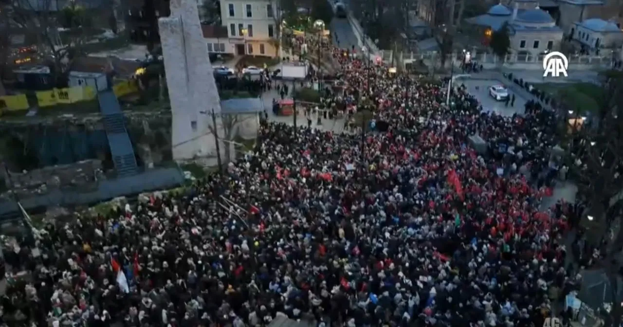 Türkiye Gençlik Vakfı (TÜGVA) öncülüğünde, "Sinmiyoruz, susmuyoruz, Filistin'i unutmuyoruz" sloganıyla yapılan eylem için Ayasofya-i Kebir Cami-i Şerifi, Sultanahmet Camii ve Eminönü'ndeki Yeni Cami ile Fatih ve Süleymaniye camilerinin önlerinde toplanan katılımcılar, kortejlerle Galata Köprüsü'ne yürüdü.