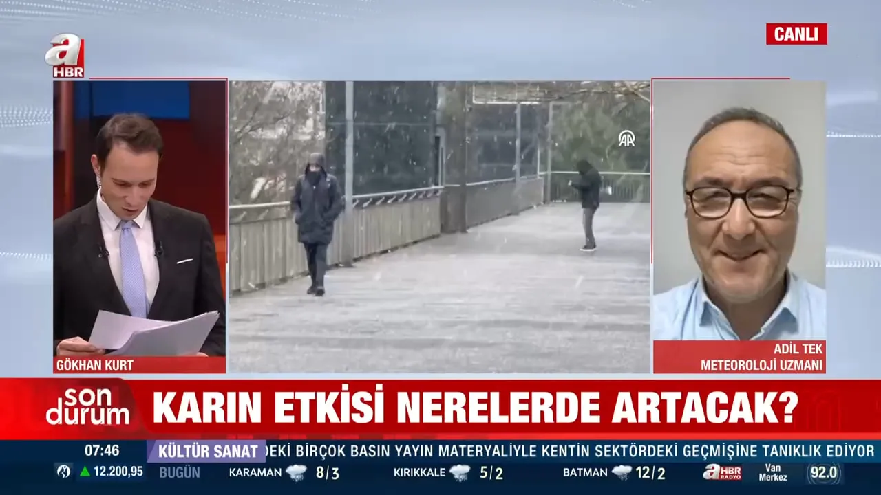 Ocak ayının ortasında Türkiye, Balkanlar’dan gelen soğuk hava dalgasının etkisine girdi. Sıcaklıklar hızla düşerken İstanbul’da beklenen kar yağışı başladı. İstanbul ve Ankara’da eğitime ara verildi. Meteoroloji bugün için 41 ilde sarı kodlu uyarı yayımladı. A Haber'e konuşan Meteoroloji Uzmanı Adil Tek, İstanbul’da kar yağışının sabah saatlerinde daha çok havada görüldüğünü, sıcaklıkların düşmesiyle birlikte öğle saatlerinden itibaren karın zeminde tutmaya başlayacağını ve yağışın gün boyunca etkisini sürdüreceğini söyledi.