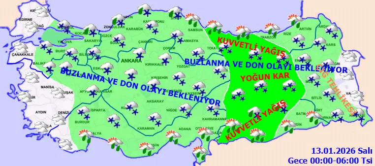 Türkiye genelinde soğuk hava dalgası etkisini sürdürüyor. Birçok bölgede karla karışık yağmur ve kar yağışı beklenirken, buzlanma, don ve kuvvetli rüzgâr uyarıları öne çıkıyor.