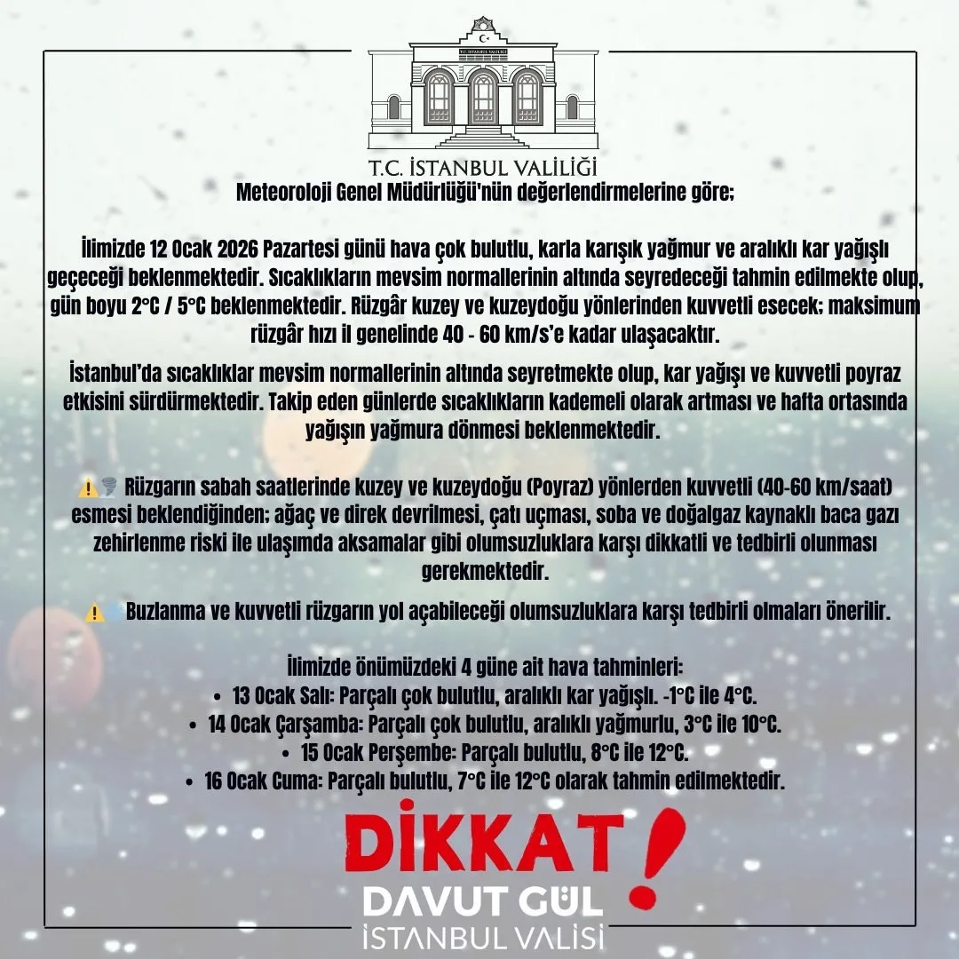 İstanbul’da sıcaklıklar mevsim normallerinin altında seyretmekte olup, kar yağışı ve kuvvetli poyraz etkisini sürdürmektedir. Takip eden günlerde sıcaklıkların kademeli olarak artması ve hafta ortasında yağışın yağmura dönmesi beklenmektedir.