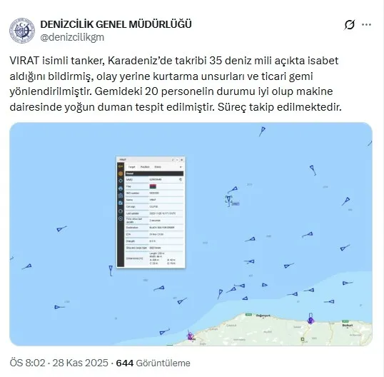 VIRAT isimli tanker, Karadeniz’de takribi 35 deniz mili açıkta isabet aldığını bildirmiş, olay yerine kurtarma unsurları ve ticari gemi yönlendirilmiştir. Gemideki 20 personelin durumu iyi olup makine dairesinde yoğun duman tespit edilmiştir. Süreç takip edilmektedir.