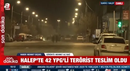Suriye’de Şam yönetiminin terör örgütü YPG/SDG unsurlarına yönelik başlattığı operasyonlar sürüyor. Halep’ten gelişmeleri aktaran A Haber, bölgeden sıcak görüntüler paylaştı. A Haber Muhabiri Mehmet Geçgel, operasyonlar kapsamında 42 YPG’li teröristin teslim olduğunu bildirdi.