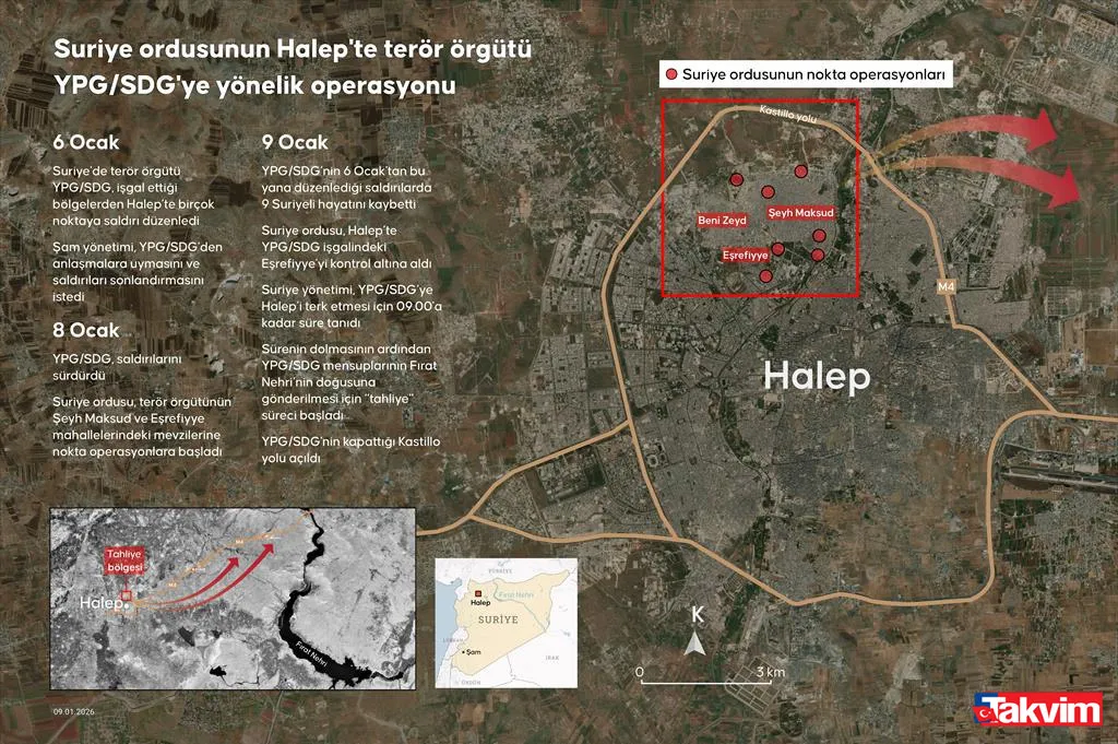 Halep’te terör örgütü YPG/SDG’nin sivilleri hedef alan saldırıları sürerken, Suriye ordusu Eşrefiye, Şeyh Maksud ve Beni Zeyd mahallelerinde terör örgütü mevzilerine yönelik operasyon başlattı. Saldırılarda 10 kişinin hayatını kaybettiği bildirilirken, Eşrefiyye ve Beni Zeyd Mahallesi'nde büyük ölçüde kontrolü sağlandı. Şam son olarak saat 16.00-18.00 arasında sivillere Şeyh Maksud'u boşaltma çağrısı yaptı. SDG'ye büyük operasyon başlayacağı belirtilirken ABD'nin Ankara Büyükelçisi ve Suriye Özel Temsilcisi Tom Barrack'ın Şam'da olduğu bildirildi.