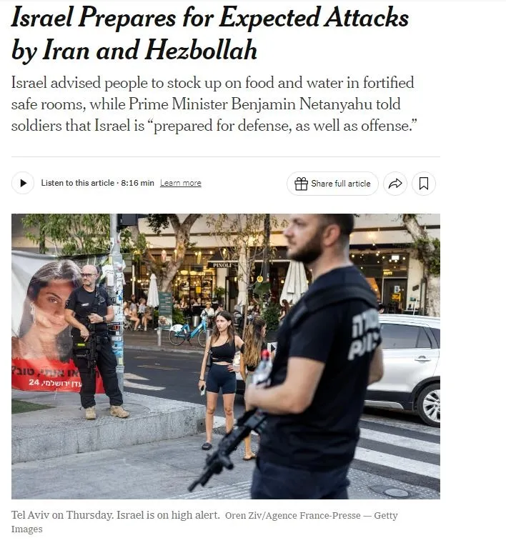 The New York Times'ın haberine göre; İsrail, halka güvenli odalarda yiyecek ve su stoklamaları tavsiyesinde bulundu. Başbakan Binyamin Netanyahu askerlere, İsrail'in"saldırıya olduğu kadar savunmaya da hazır olduğunu" söyledi. Haberde, saldırının ne zaman gerçekleşeceğine dair istihbarat zayıf ve sık sık değiştiği belirtildi. Ancak İsrailli yetkililer Hizbullah'ın, İran'ın kendi misillemesini yapmadan önce ayrı bir saldırı düzenlemesini beklediğini söyledi. İsrail'deki hastaneler tıbbi ve cerrahi malzemeler, binlerce ünite kan, dizel yakıt ve benzin stoklayarak savaşa hazırlanıyor. Hastaların yer altı koğuşlarına taşınması bekleniyor ve arama kurtarma ekipleri büyük şehirlerde konuşlandırıldı.